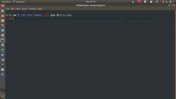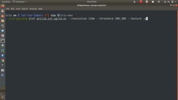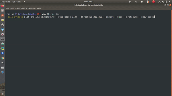 iris-pyvista plot ...to render an unstructured cube from fileiris-pyvista show ...to render a VTK fileiris-pyvista summary ...to show a cube summary from fileiris-pyvista --helpfor further detailsiris-pyvista plotis the default sub-commandclimof thecmapto cover the full extent of the data (specifically for a 2D time-series)Consult Iris pull request check list