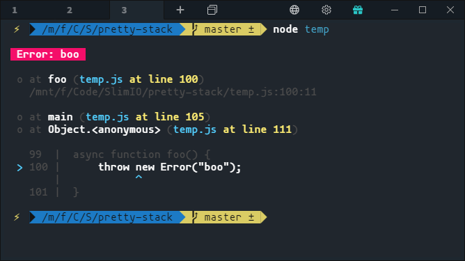 Pretty Stack Trace to stdout in TTY. Use clean-stack of sindresorhus under the hood to improve the whole experience.