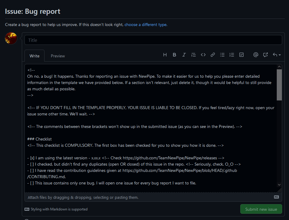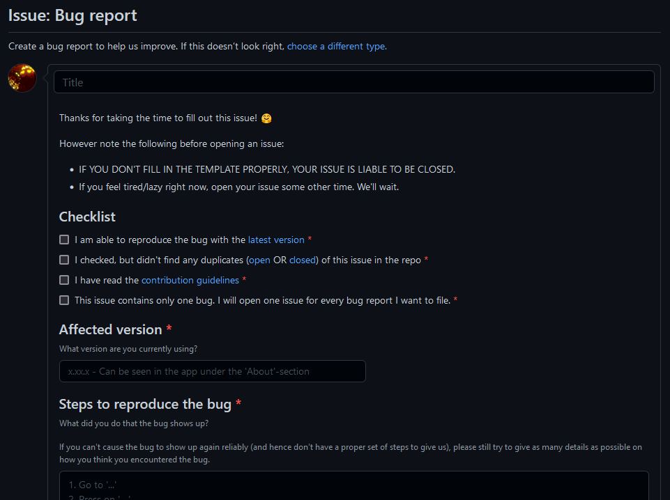 Please feel free to take some inspiration from https://github.com/TheAssassin/AppImageLauncher/tree/master/.github/ISSUE_TEMPLATE. I think you mostly converted the existing template, but there is some potential for improvements. I'll leave a review shortly. |