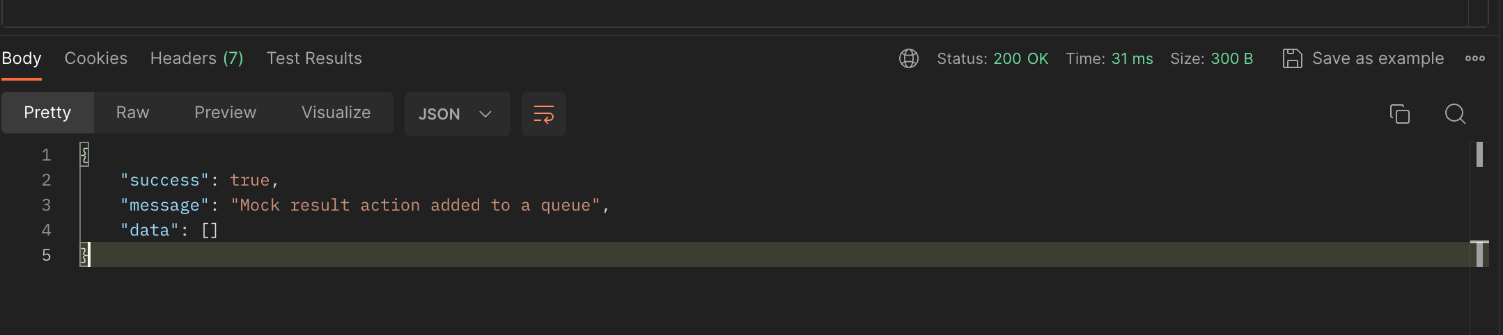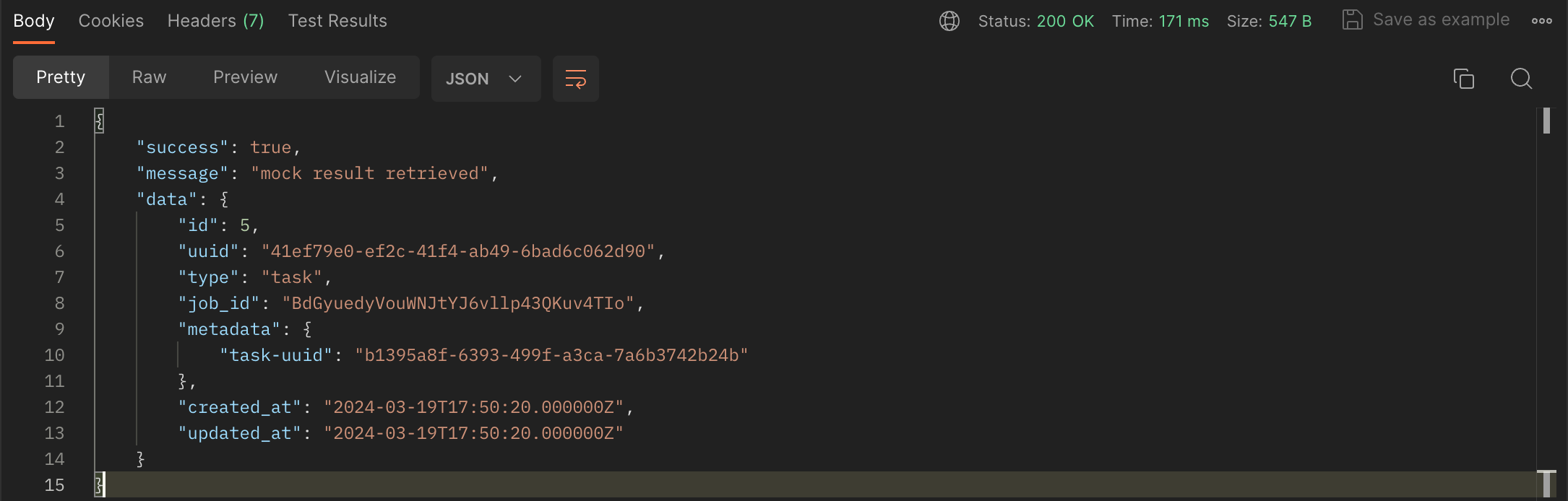 - Description: Creates a new task, adds a mock result action to a queue for asynchronous processing, returns a Job ID, and stores the Job in a database.