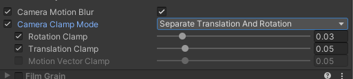 | | **Camera Clamp Mode** | Determine how the component of the motion vectors coming from the camera is clamped. It is important to remember that clamping the camera component separately, velocities relative to camera might change too (e.g. a GameObject parented to a camera when the camera moves might not have a 0 motion vector anymore). | |
