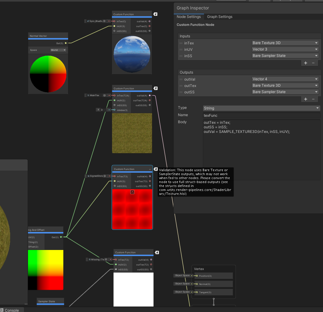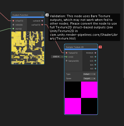 Tested that an old CustomFunctionNode that used to return a Texture2D output, is upgraded to convert the Bare Texture2D output to a UnityTexture2D struct, and continues working (at least in all cases when it used to work -- i.e. when explicit sampler states are provided). It also now generates a warning on the CustomFunction node: