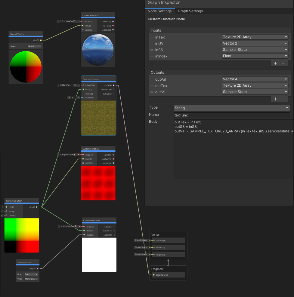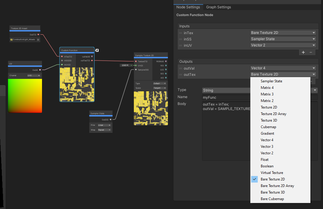 CustomFunctionNodes of type File, taking SamplerState inputs, will not compile until the user converts the SamplerState type to use the new UnitySamplerState struct. (type String works, as we fix the type automatically).