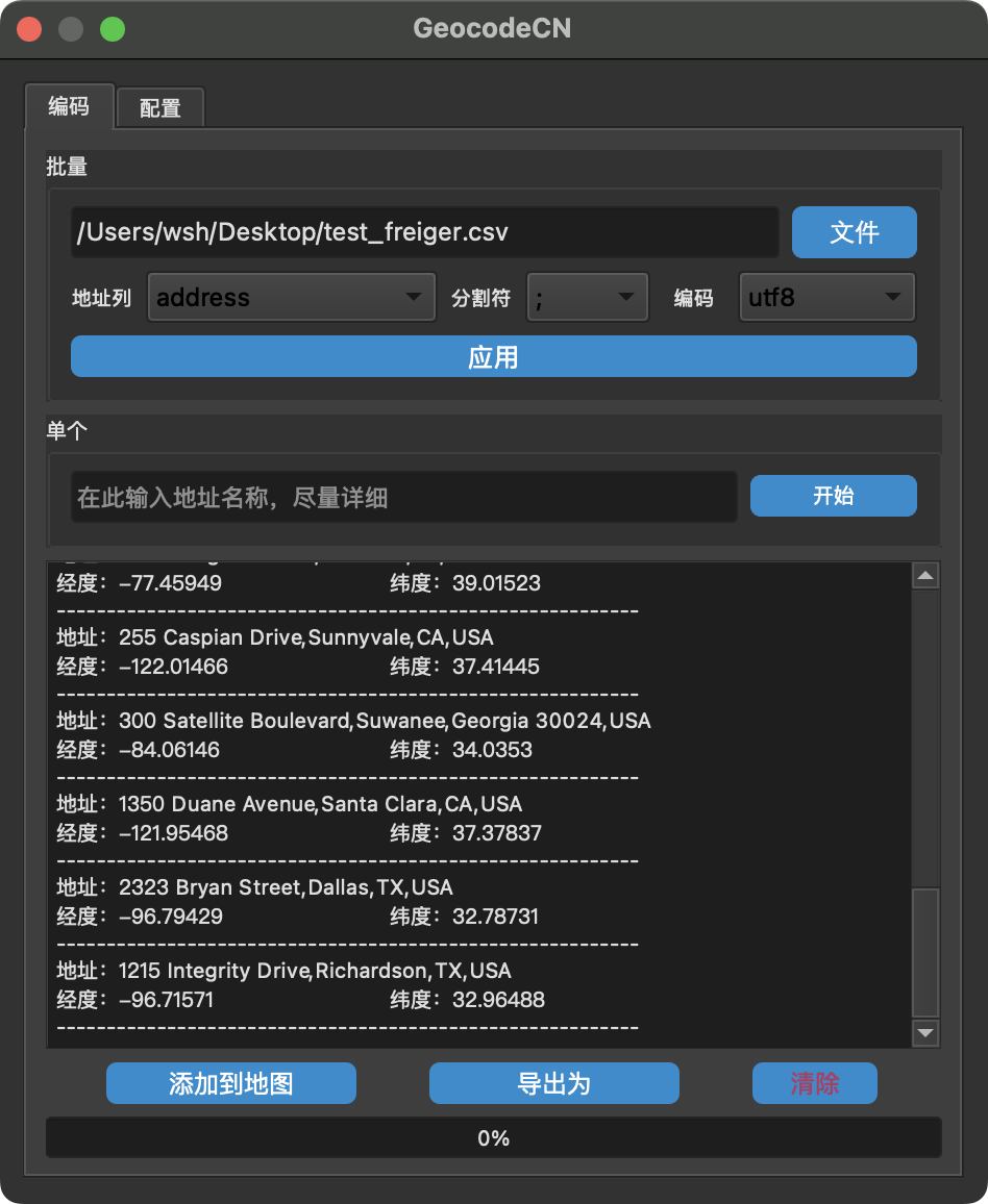 需要将所有地址保存到一个CSV,然后在插件里选中它,接着指定表格中哪一列作为地址