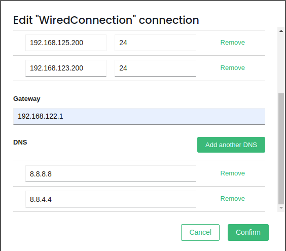 Currently the ipv4 dns configuration is not touched, we should allow to set some DNS server specially when the IP configuration is statically configured.