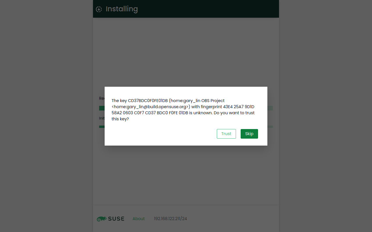 Although users are not expected to use their own repositories at this time, it is not uncommon that we need to try some package that lives in a development repository in OBS. In those cases, you might need to import the GPG key.