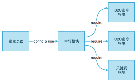 PC上的密令玩法会接入淘宝/天猫/海淘的首页、搜索结果等页面。与Phone和Pad不同的是,这次我们暴露给外部页面的是KISSY模块,而非页面。KISSY模块的依赖关系如下图所示: