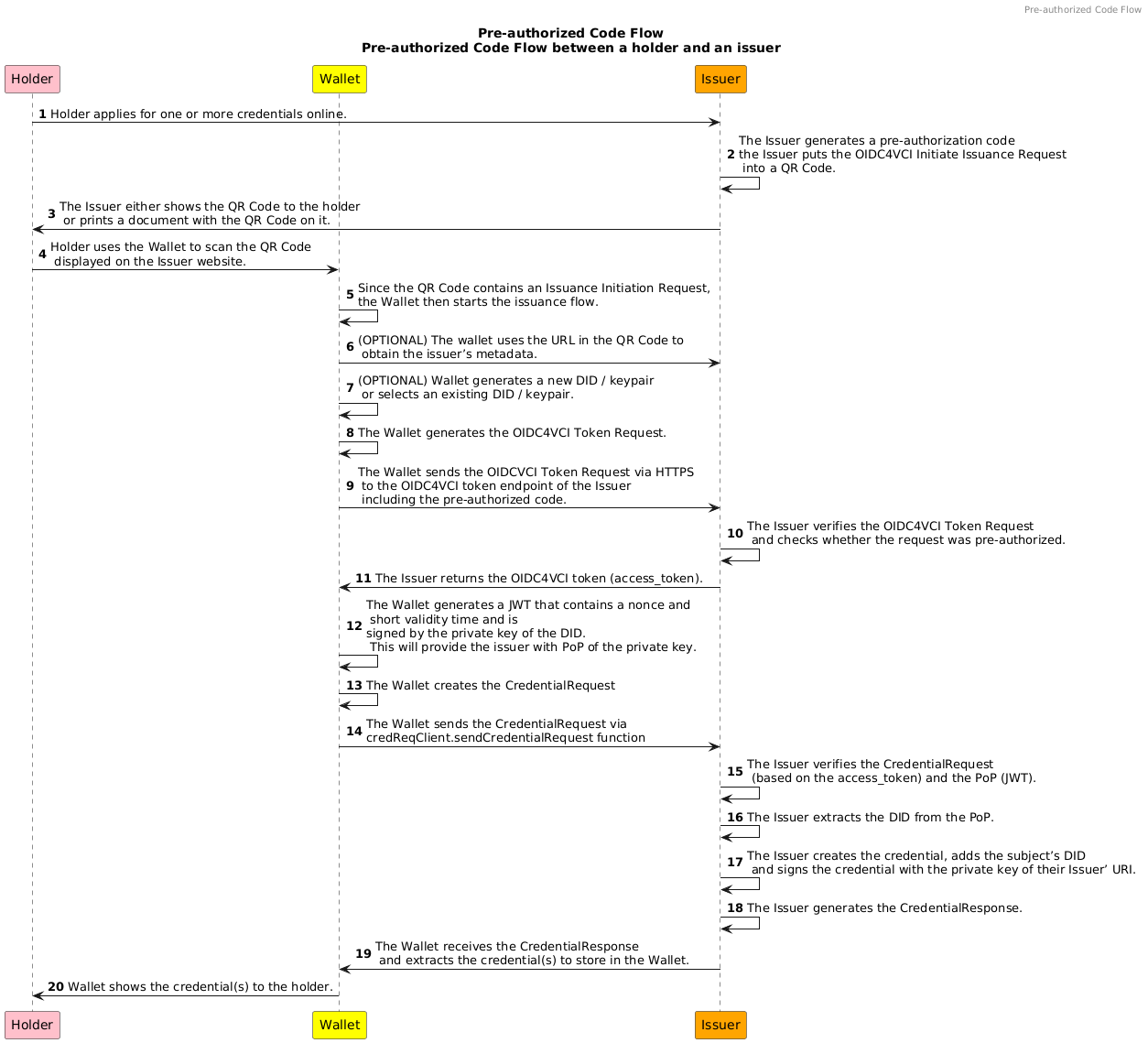 The below diagram shows the steps involved in the pre-authorized code flow. Note that inner wallet functionalities (like