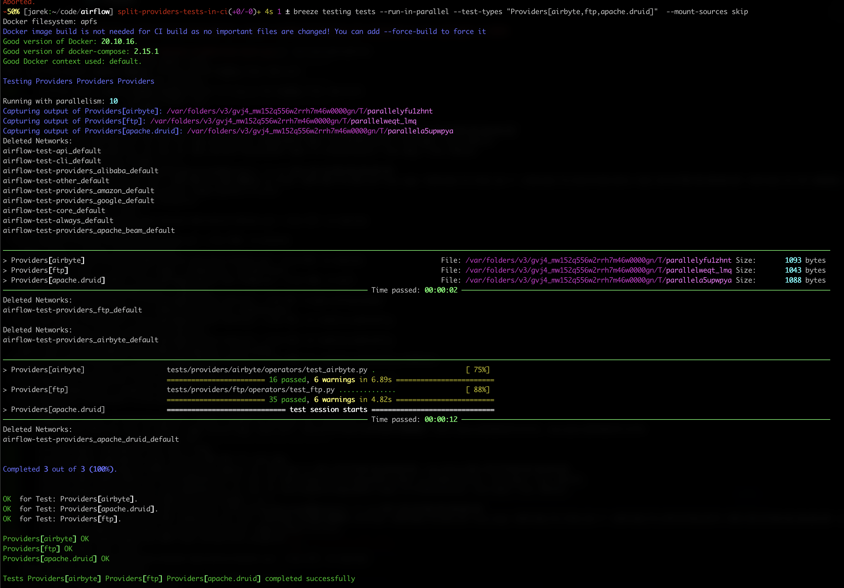 Example output: Also - it allows to run all the tests locally (including all providers) much faster (if you have multiple CPUS and a lot of memory) if you want to see if you have not broken any of the providers. Plus as a side effect, if any of the provider tests fail, you know exactly which one and seeing the output of that test is much easier (unfolding the result of single provider is much faster and it's easier to scroll through the output of only that provider. |