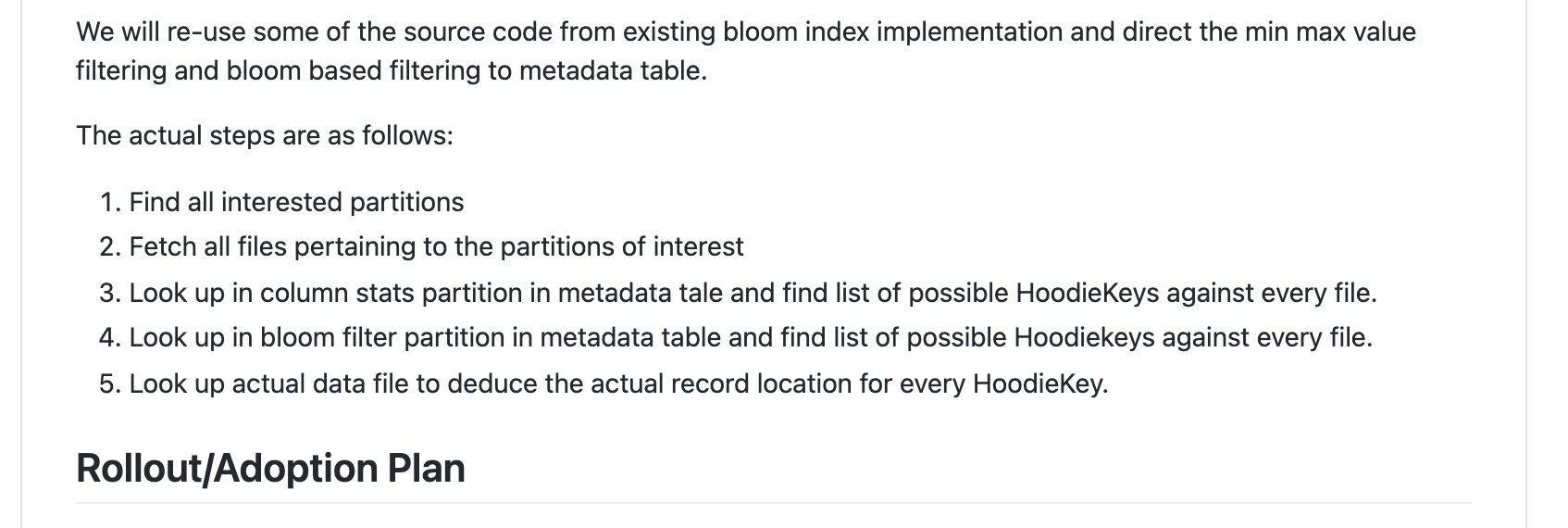 | used record index is the HoodieBloomIndex. For larger installations and for global index types, performance might be an issue | ||