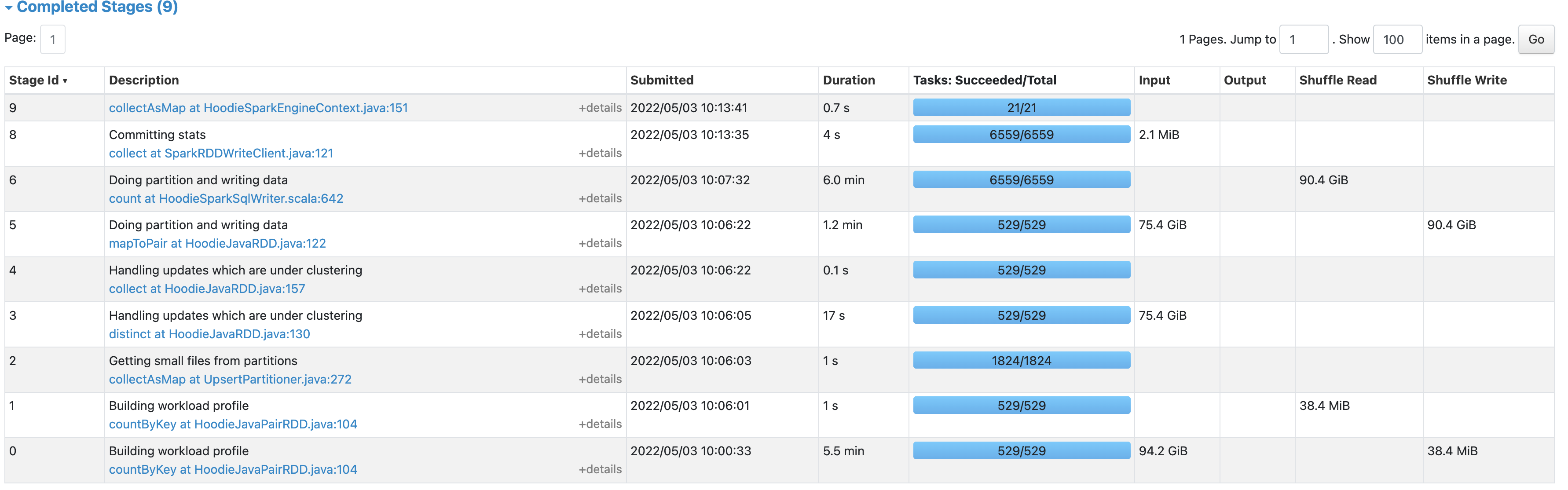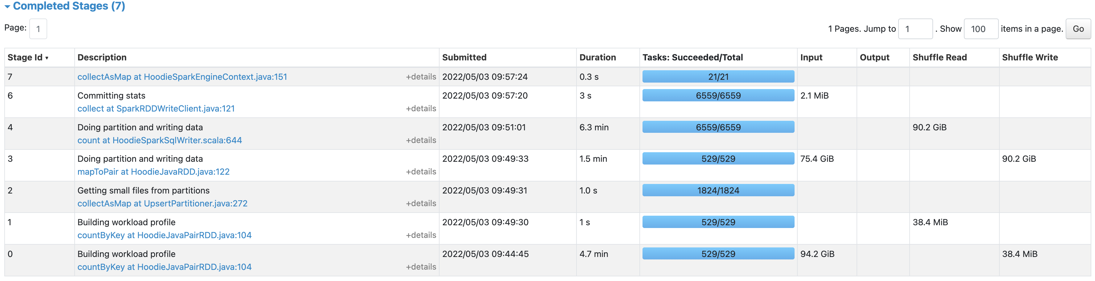 …che#37) * [MINOR] Update alter rename command class type for pattern matching (apache#5381) * [HUDI-3977] Flink hudi table with date type partition path throws HoodieNotSupportedException (apache#5432) * Claim RFC 52 for Introduce Secondary Index to Improve HUDI Query Performance (apache#5441) * [HUDI-3945] After the async compaction operation is complete, the task should exit. (apache#5391) Co-authored-by: y00617041 <[email protected]> * [HUDI-3815] Fix docs description of metadata.compaction.delta_commits default value error (apache#5368) Co-authored-by: pusheng.li01 <[email protected]> * [HUDI-3943] Some description fixes for 0.10.1 docs (apache#5447) * [MINOR] support different cleaning policy for flink (apache#5459) * [HUDI-3758] Fix duplicate fileId error in MOR table type with flink bucket hash Index (apache#5185) * fix duplicate fileId with bucket Index * replace to load FileGroup from FileSystemView * [MINOR] Fix CI by ignoring SparkContext error (apache#5468) Sets spark.driver.allowMultipleContexts = true when constructing Spark conf in UtilHelpers * [HUDI-3862] Fix default configurations of HoodieHBaseIndexConfig (apache#5308) Co-authored-by: xicm <[email protected]> * [HUDI-3978] Fix use of partition path field as hive partition field in flink (apache#5434) * Fix partition path fields as hive sync partition fields error * [MINOR] Update DOAP for release 0.11.0 (apache#5467) * [HUDI-3211][RFC-44] Add RFC for Hudi Connector for Presto (apache#4563) * Add RFC doc Co-authored-by: Sagar Sumit <[email protected]> * Add note regarding catalog naming Co-authored-by: Sagar Sumit <[email protected]> * [MINOR] Update RFC status (apache#5486) * [HUDI-4005] Update release scripts to help validation (apache#5479) * [HUDI-4031] Avoid clustering update handling when no pending replacecommit (apache#5487) * [HUDI-3667] Run unit tests of hudi-integ-tests in CI (apache#5078) * [MINOR] Optimize code logic (apache#5499) * [HUDI-2875] Make HoodieParquetWriter Thread safe and memory executor exit gracefully (apache#4264) * [HUDI-4042] Support truncate-partition for Spark-3.2 (apache#5506) * [HUDI-4017] Improve spark sql coverage in CI (apache#5512) Add GitHub actions tasks to run spark sql UTs under spark 3.1 and 3.2. * [HUDI-3675] Adding post write termination strategy to deltastreamer continuous mode (apache#5073) - Added a postWriteTerminationStrategy to deltastreamer continuous mode. One can enable by setting the appropriate termination strategy using DeltastreamerConfig.postWriteTerminationStrategyClass. If not, continuous mode is expected to run forever. - Added one concrete impl for termination strategy as NoNewDataTerminationStrategy which shuts down deltastreamer if there is no new data to consume from source for N consecutive rounds. * [HUDI-3849] AvroDeserializer supports AVRO_REBASE_MODE_IN_READ configuration (apache#5287) * [MINOR] Fixing class not found when using flink and enable metadata table (apache#5527) * [MINOR] fixing flaky tests in deltastreamer tests (apache#5521) * [HUDI-4055]refactor ratelimiter to avoid stack overflow (apache#5530) * [MINOR] Fixing close for HoodieCatalog's test (apache#5531) * [MINOR] Fixing close for HoodieCatalog's test * [HUDI-4053] Flaky ITTestHoodieDataSource.testStreamWriteBatchReadOpti… (apache#5526) * [HUDI-4053] Flaky ITTestHoodieDataSource.testStreamWriteBatchReadOptimized Co-authored-by: xicm <[email protected]> * [HUDI-3995] Making perf optimizations for bulk insert row writer path (apache#5462) - Avoid using udf for key generator for SimpleKeyGen and NonPartitionedKeyGen. - Fixed NonPartitioned Key generator to directly fetch record key from row rather than involving GenericRecord. - Other minor fixes around using static values instead of looking up hashmap. * [HUDI-4044] When reading data from flink-hudi to external storage, the … (apache#5516) Co-authored-by: aliceyyan <[email protected]> * [HUDI-4003] Try to read all the log file to parse schema (apache#5473) * [HUDI-4038] Avoid calling `getDataSize` after every record written (apache#5497) - getDataSize has non-trivial overhead in the current ParquetWriter impl, requiring traversal of already composed Column Groups in memory. Instead we can sample these calls to getDataSize to amortize its cost. Co-authored-by: sivabalan <[email protected]> * [HUDI-4079] Supports showing table comment for hudi with spark3 (apache#5546) * [HUDI-4085] Fixing flakiness with parquet empty batch tests in TestHoodieDeltaStreamer (apache#5559) * [HUDI-3963][Claim RFC number 53] Use Lock-Free Message Queue Improving Hoodie Writing Efficiency. (apache#5562) Co-authored-by: yuezhang <[email protected]> * [HUDI-4018][HUDI-4027] Adding integ test yamls for immutable use-cases. Added delete partition support to integ tests (apache#5501) - Added pure immutable test yamls to integ test framework. Added SparkBulkInsertNode as part of it. - Added delete_partition support to integ test framework using spark-datasource. - Added a single yaml to test all non core write operations (insert overwrite, insert overwrite table and delete partitions) - Added tests for 4 concurrent spark datasource writers (multi-writer tests). - Fixed readme w/ sample commands for multi-writer. * [HUDI-3336][HUDI-FLINK]Support custom hadoop config for flink (apache#5528) * [HUDI-3336][HUDI-FLINK]Support custom hadoop config for flink * [MINOR] Fix a NPE for Option (apache#5461) * [HUDI-4078][HUDI-FLINK]BootstrapOperator contains the pending compact… (apache#5545) * [HUDI-4078][HUDI-FLINK]BootstrapOperator contains the pending compaction files * [HUDI-3336][HUDI-FLINK]Support custom hadoop config for flink (apache#5574) * [HUDI-3336][HUDI-FLINK]Support custom hadoop config for flink * [HUDI-4072] Fix NULL schema for empty batches in deltastreamer (apache#5543) * [HUDI-4097] add table info to jobStatus (apache#5529) Co-authored-by: wqwl611 <[email protected]> * [HUDI-3980] Suport kerberos hbase index (apache#5464) - Add configurations in Ho