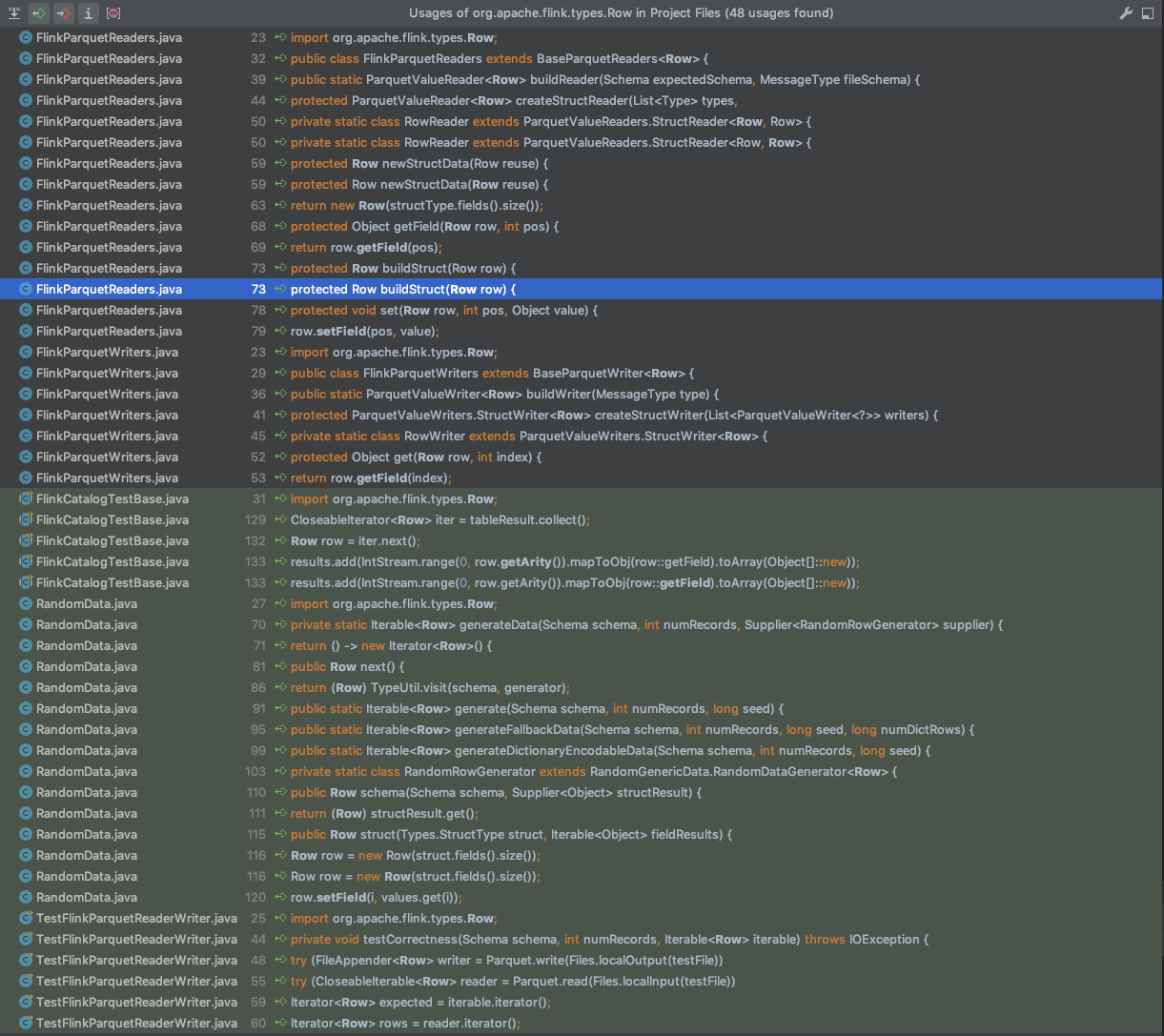 FlinkParquetReaders,FlinkParquetWriters,RandomData,TestFlinkParquetReaderWriterwill referenceRowdata type.Once we merged the pull requests about RowData parquet readers (#1266) and parquet writers (#1272), there should be no other core classes that will use
