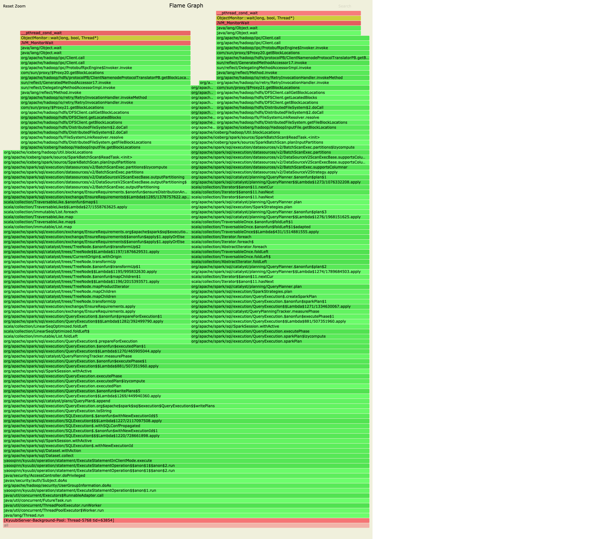 I've dumped the wallclock time profiling. We can see the problem lies in SparkBatchScan.planInputPartitions()