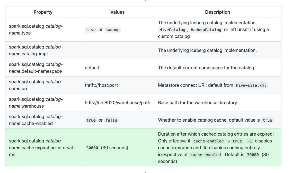 | | spark.sql.catalog._catalog-name_.cache-enabled | `true` or `false` | Whether to enable catalog cache, default value is `true` | | ||