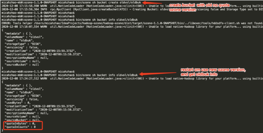 long quotaInBytes are new fields in the bucketArgs, this field will go to 0 by default in the old bucket when the old cluster is upgraded. At this point, the data writes are rejected.