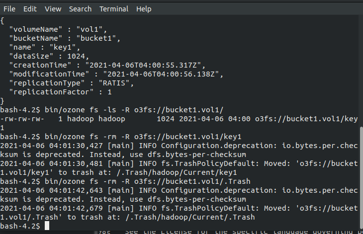 <property> <name>fs.trash.classname</name> <value>org.apache.hadoop.ozone.om.TrashPolicyDefault</value> </property>OR leave unchanged (default behavior)enable Trash