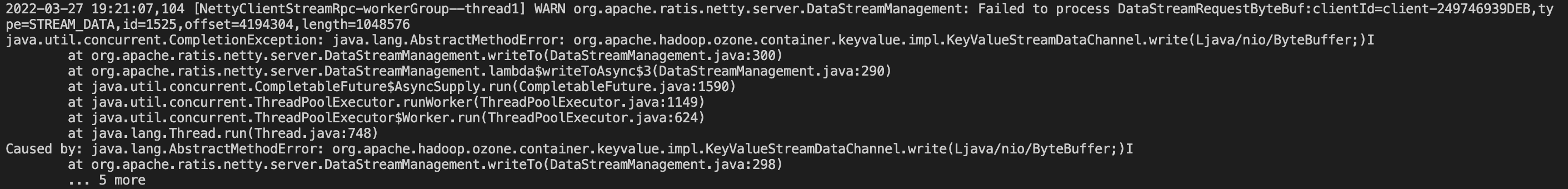 @captainzmc , I guess you somehow were using some old version of Ratis/Ozone since you got AbstractMethodError. Please try deleting the maven cache and then rebuild everything.