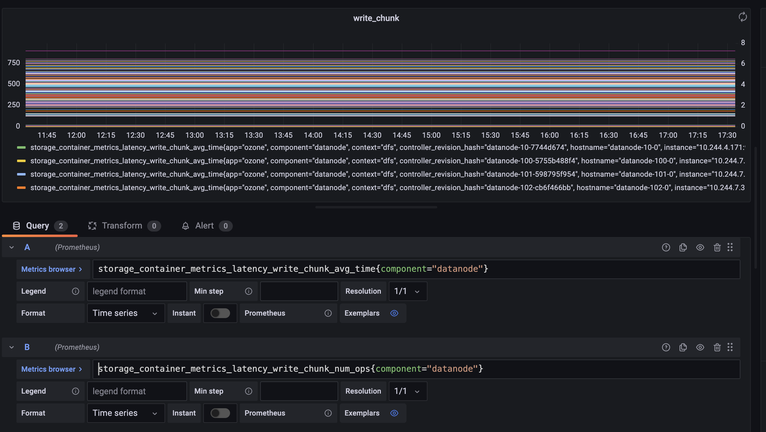 The raw thought is to make the overall graph more straightforward. As there are a lot of DN DB instances in a normal cluster, we could detect the overall trend instead of each DB. Besides that here I put two metrics together with two Y-axises.