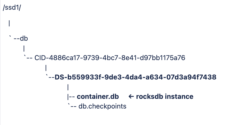 StorageVolumetypeDbVolumefor optional dedicated SSDs for db instances to speed up meta operations.We have one subdirectory for each data volume under a db volume, with the StorageID(UUID) of the data volume as the name of the subdirectory.