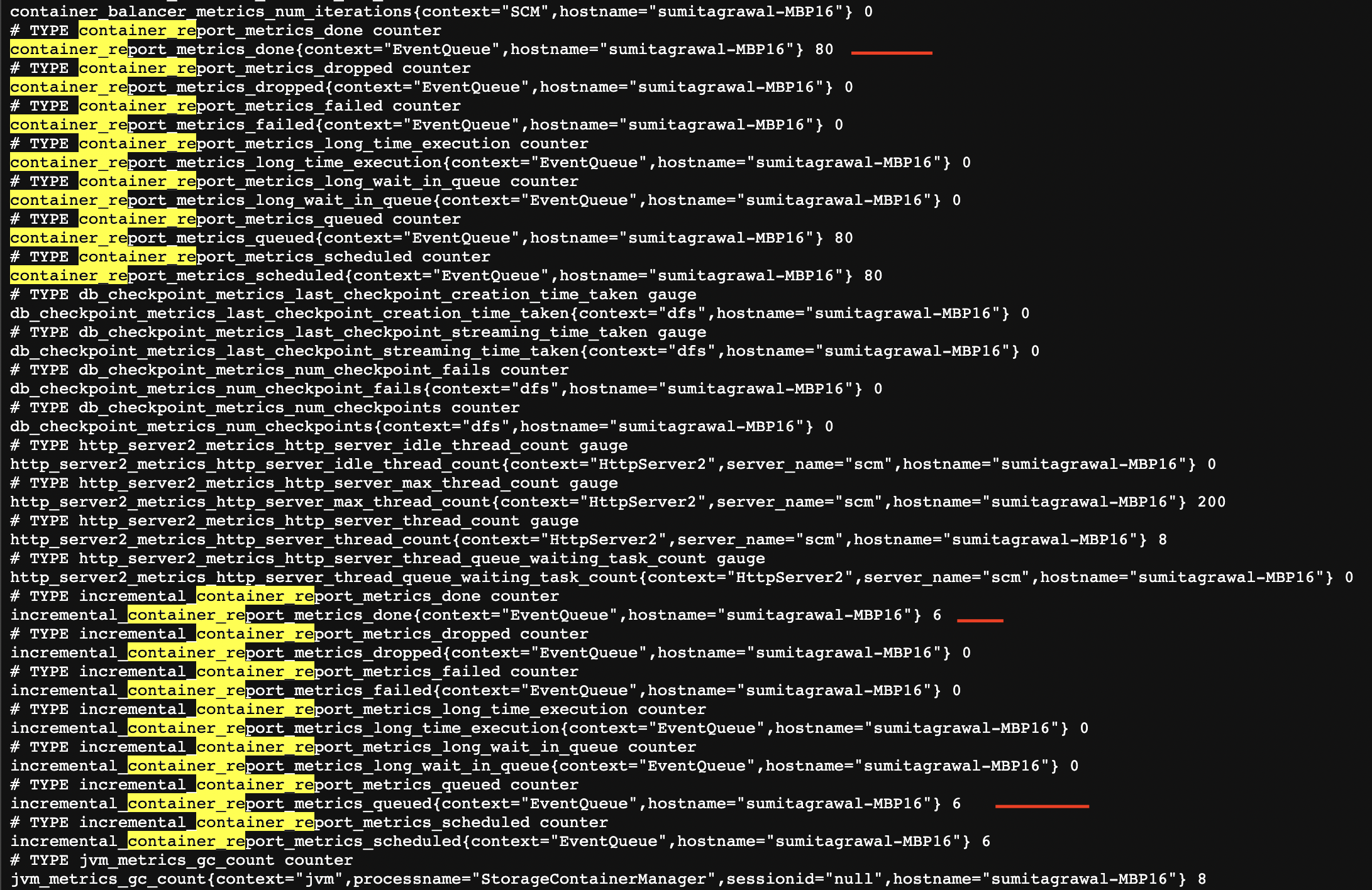 Thanks @sumitagrawl for filing this jira. A general comment - on the subject of this jira, Container Report at SCM is not coming separately for ICR and FCR in prometheus endpoint . Metrics for the full container report, FCR and the incremental container reports, ICR appear to be collected separately with the Is this jira for adding additional metrics to be collected and published for FCR and ICR ? |