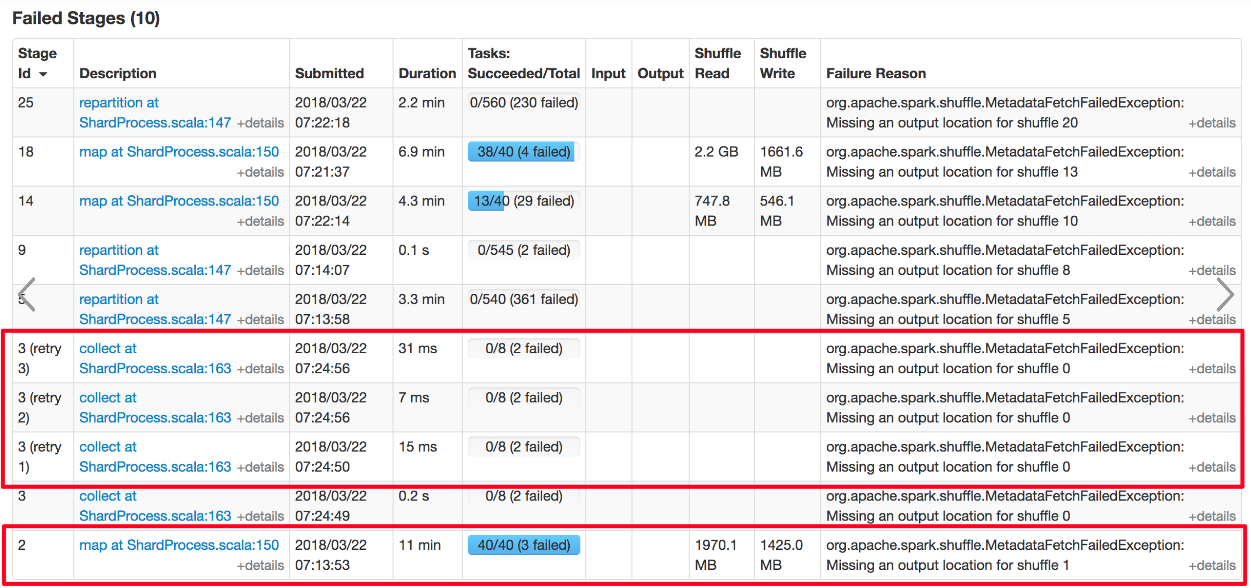 Stage 0\1\2\3 same with 20\21\22\23 in this screenshot, stage2's shuffleId is 1 but stage3's is 0 can't happen. Good description for the scenario, can't get a FetchFailed because we can get the MapStatus, but get a 'null'. If I'm not mistaken, this also because the ExecutorLost trigger Happy to discuss with all guys and sorry for can't giving more detailed log after checking the root case, this happened in Baidu online env and can't keep all logs for 1 month. I'll keep fixing the case and catching details log as mush as possible. |