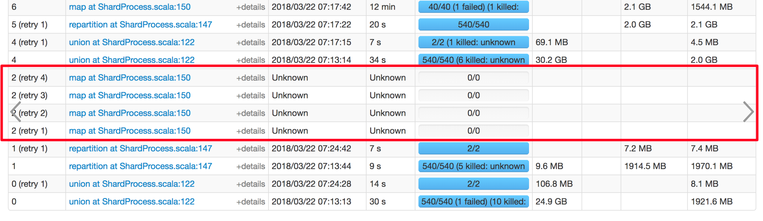 Hi, @xuanyuanking. I have some questions with the screenshot you post. Does stage 2 is correspond to the never success stage in PR description ? So, why stage 2 retry 4 times when there's no more missing tasks? As I know, if a stage has 0 task to submit, then, a child stage will be submitted soon. So, in my understanding, there's no retry for stage 2. Hope you can explain more about the screenshot. Thanks.