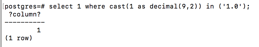 | struct<(CAST(CAST(1 AS TINYINT) AS TINYINT) IN (CAST(CAST(1 AS STRING) AS TINYINT))):boolean> |