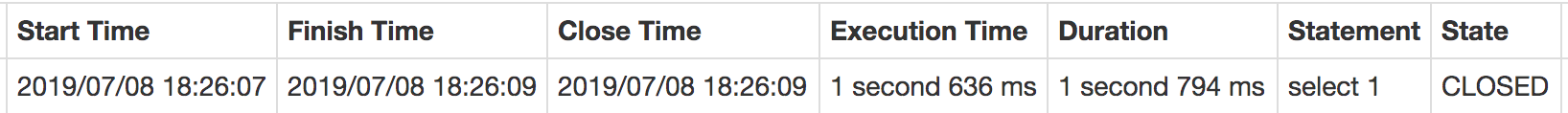 | Start Time | Finish Time | Duration | Fetch result time | Statement | State |