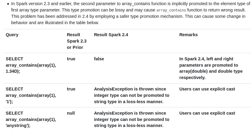 | - Since Spark 3.0, the parameter(first or second) to array_contains function is implicitly promoted to the wider type parameter. |