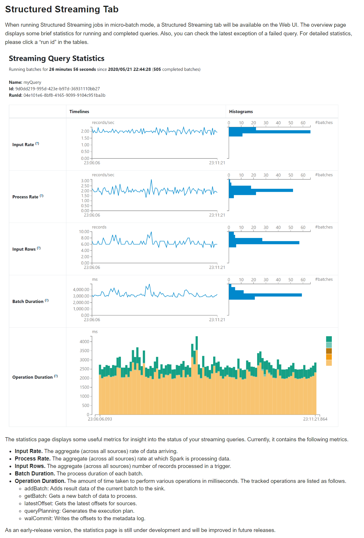 | the time used for different stages of a micro-batch execution) for insight into the status of your |