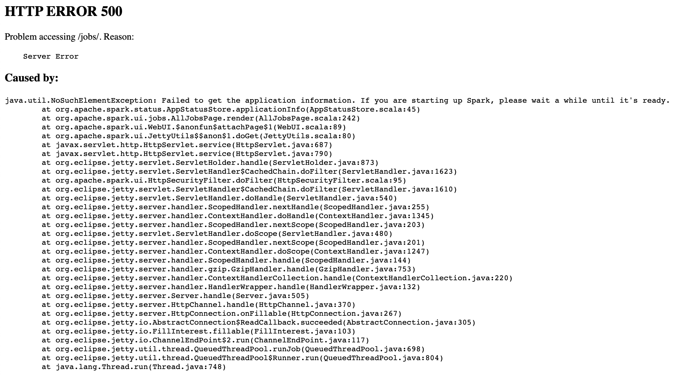 def applicationInfo(): v1.ApplicationInfo = { try { // The ApplicationInfo may not be available when Spark is starting up. store.view(classOf[ApplicationInfoWrapper]).max(1).iterator().next().info } catch { case _: NoSuchElementException => throw new SparkException("Failed to get the application information. " + "If you are starting up Spark, please wait a while until it's ready.") } }Where as the caller for this method def getSparkUser in Spark UI is not handling SparkException in the catch