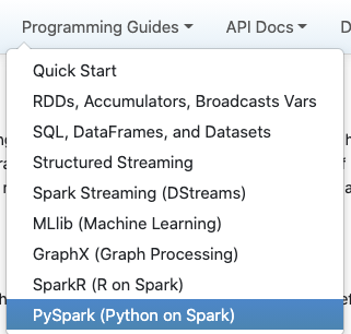 | <a class="dropdown-item" href="api/python/getting_started/index.html">PySpark (Python on Spark)</a> |