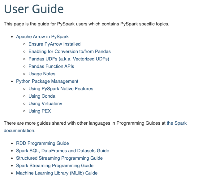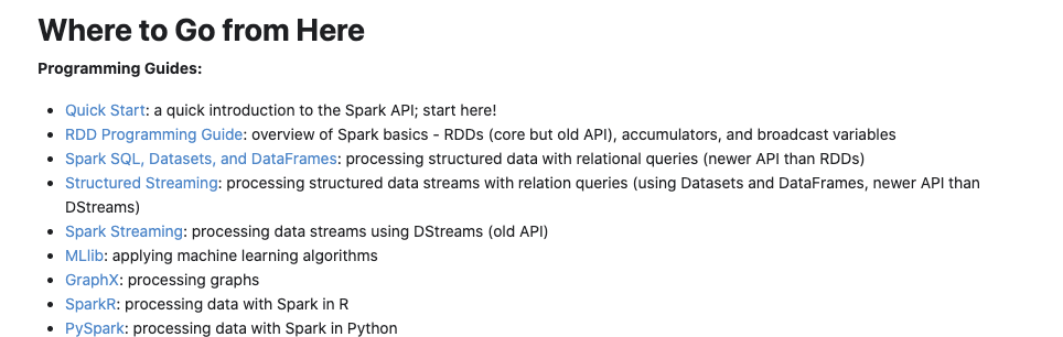 | at `the Spark documentation <http://spark.apache.org/docs/latest/index.html#where-to-go-from-here>`_. |