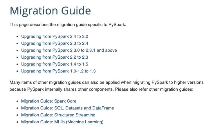 | - `Migration Guide: SQL, Datasets and DataFrame <http://spark.apache.org/docs/latest/sql-migration-guide.html>`_ | ||