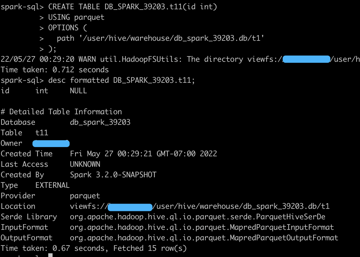 > CREATE TABLE DB_SPARK_39203.t7(id int) using parquet;