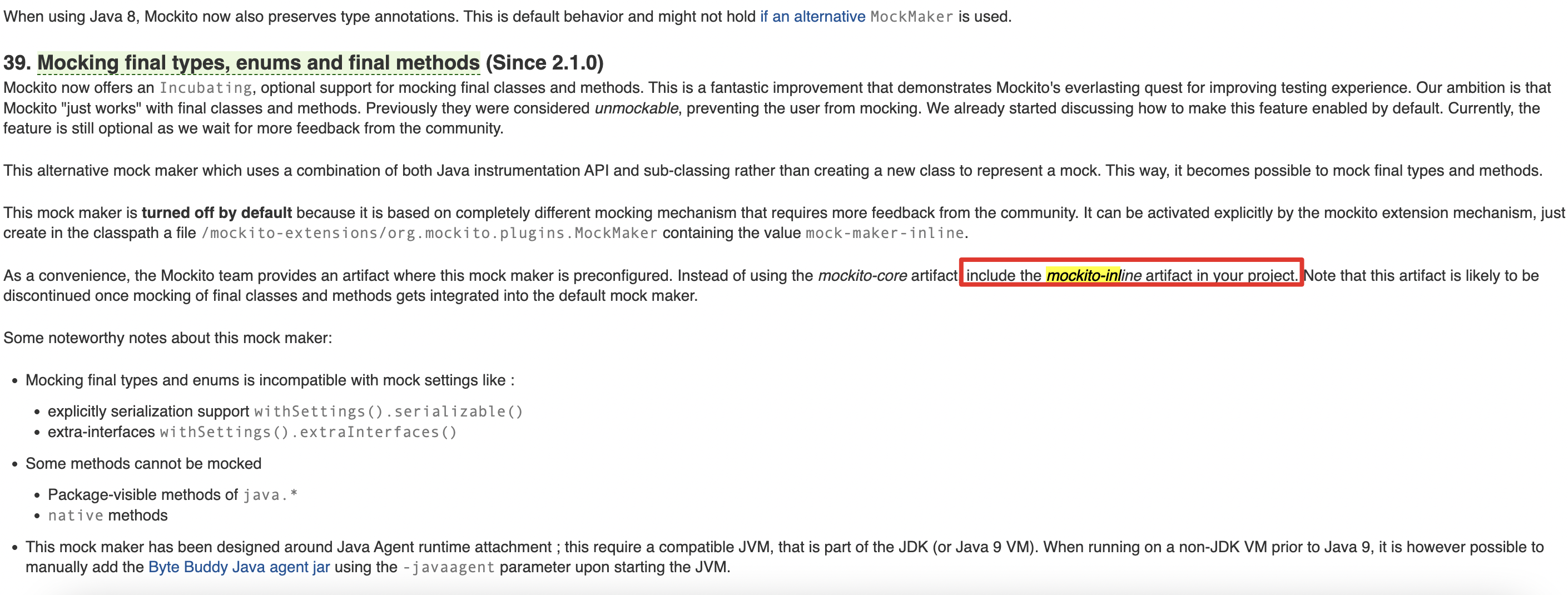 mockito-inlineis a more recommended way to use mockito to mocking final types, enums and final methodsand
