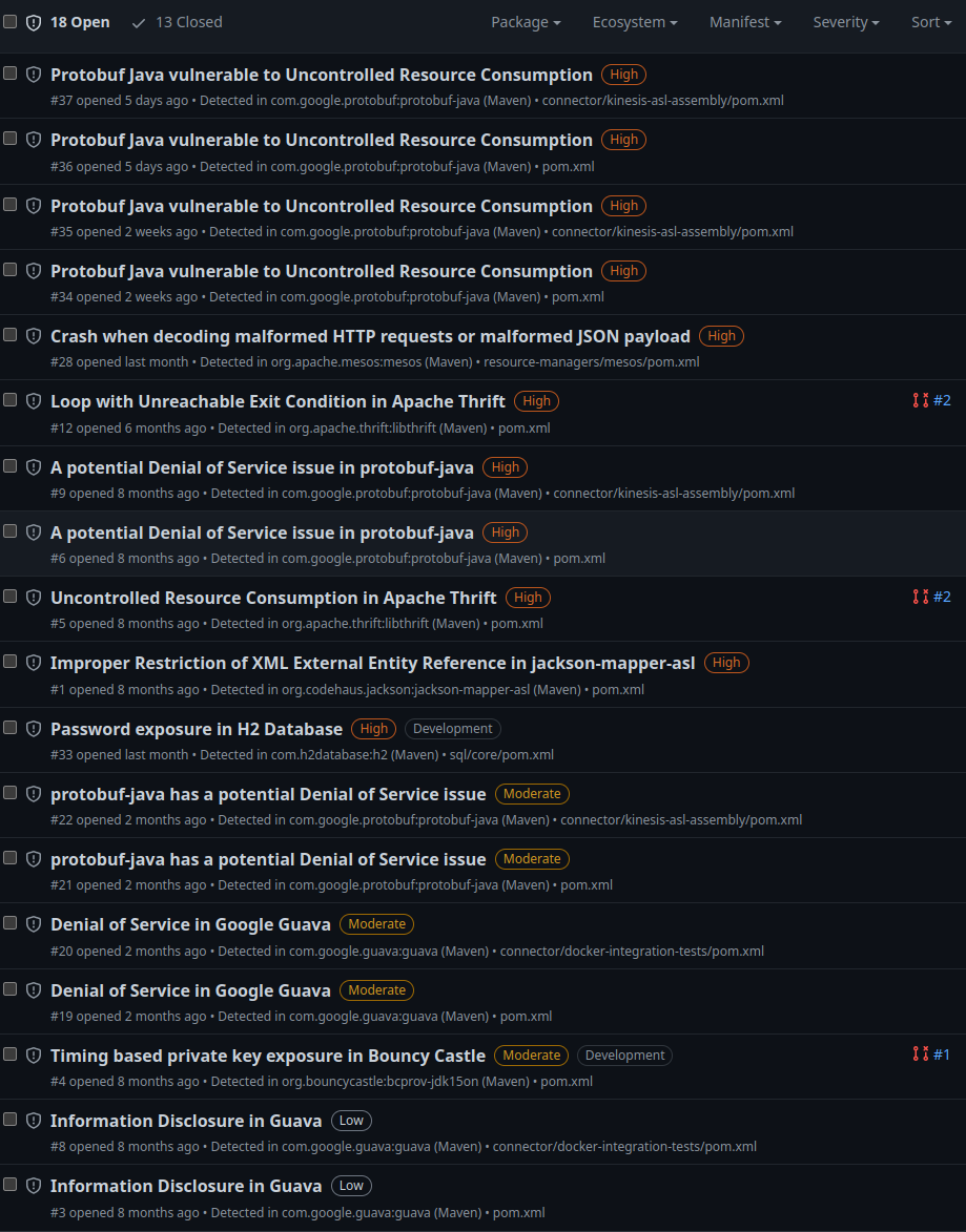 @tobiasstadler Right now, most of these PR's are related to Hadoop 2.7 which we will remove in spark 3.5 or 3.6. I also build spark master and scan code with sonar This one is for python and javascript and this is for java, scala and xml CC @panbingkun and @LuciferYang |
