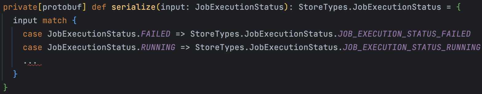 | private[protobuf] def serialize(input: JobExecutionStatus): StoreTypes.JobExecutionStatus = { | ||