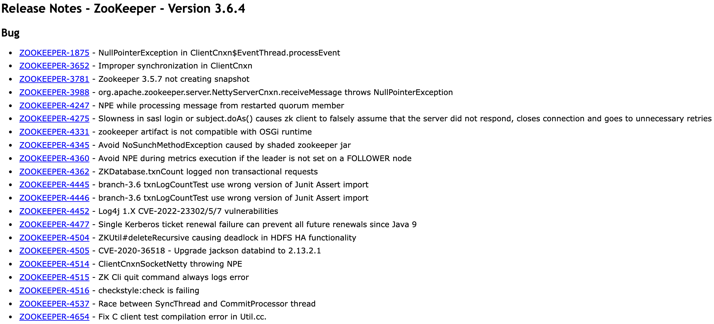 Release Notes: https://zookeeper.apache.org/doc/r3.6.4/releasenotes.html