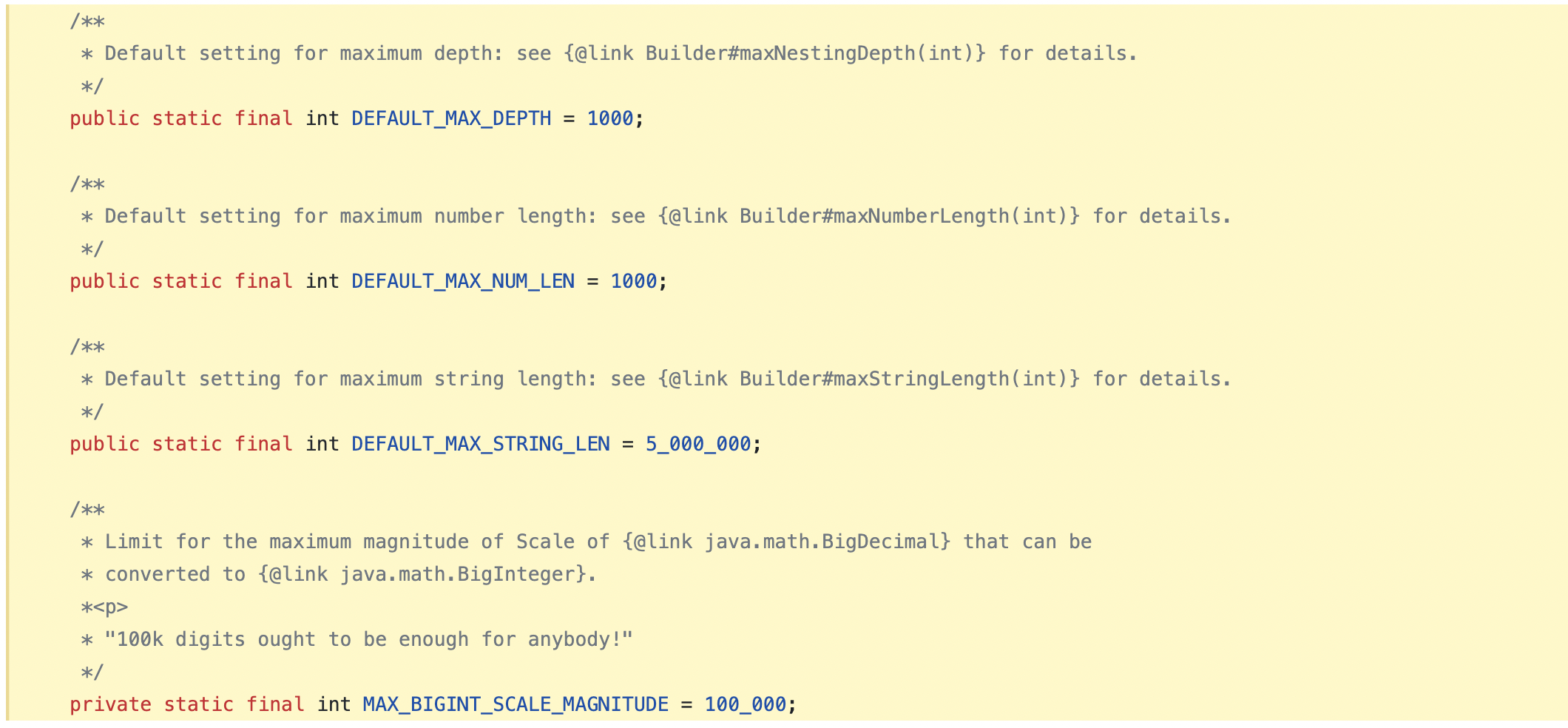 DEFAULT_MAX_DEPTH)Additionally, the maximum magnitude of scale for BigDecimal to BigInteger conversion is set to 100,000 digits (
