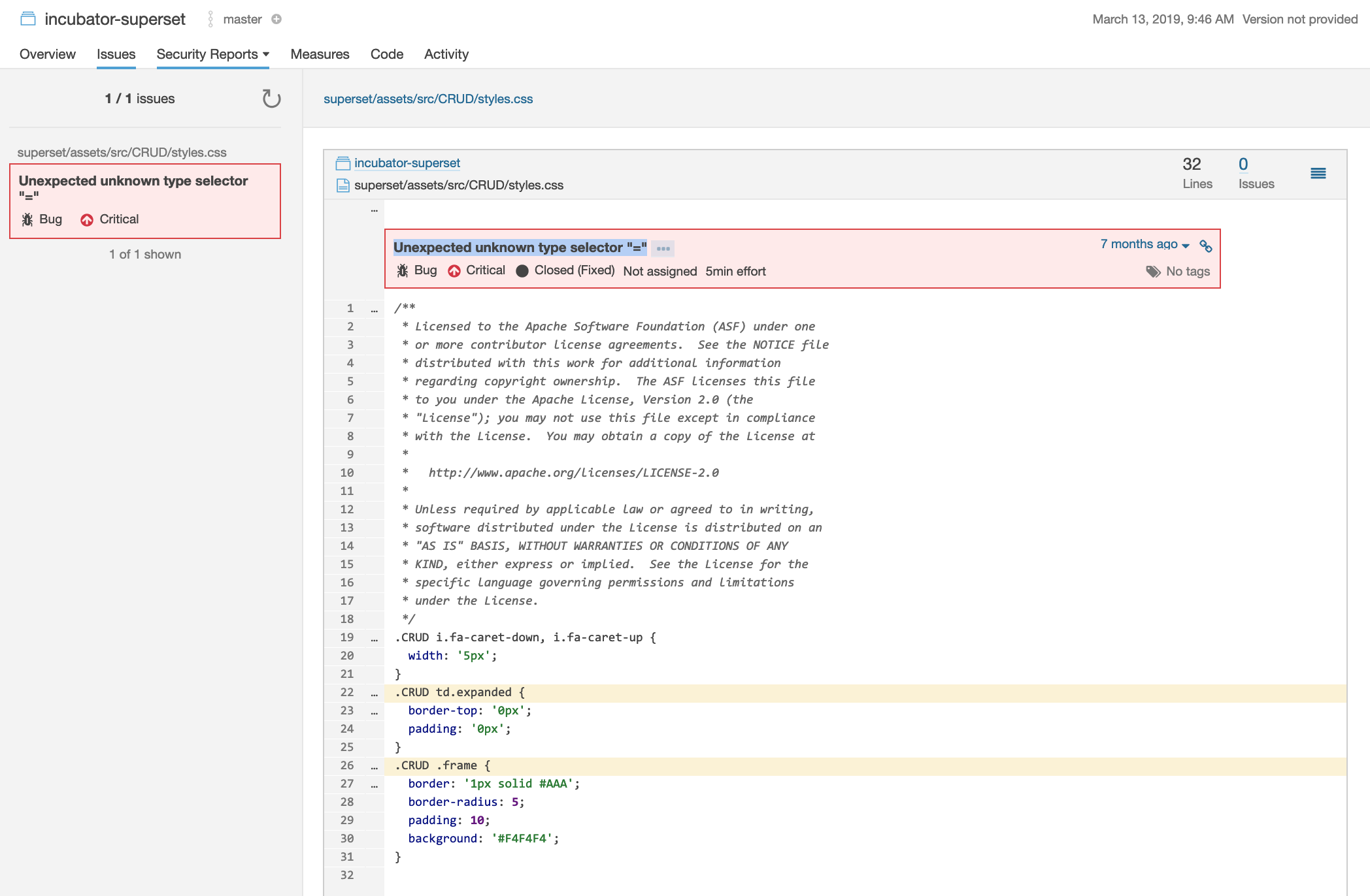 Unexpected unknown type selector "="reported by SonarQube as a critical vulnerabilitySuperset version