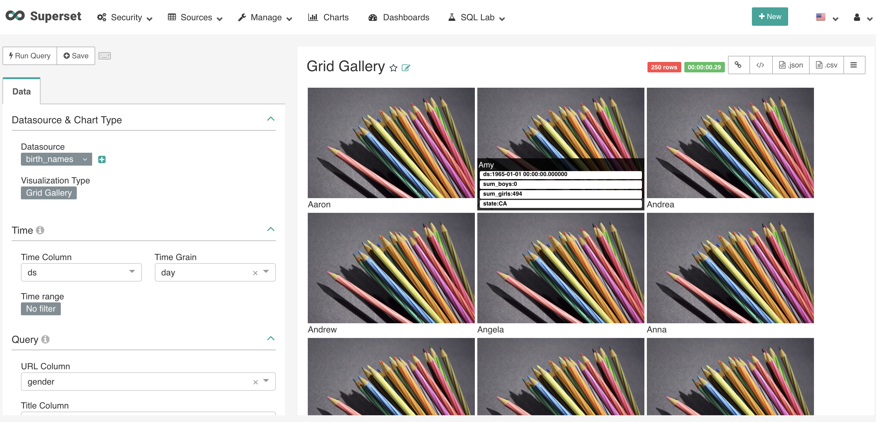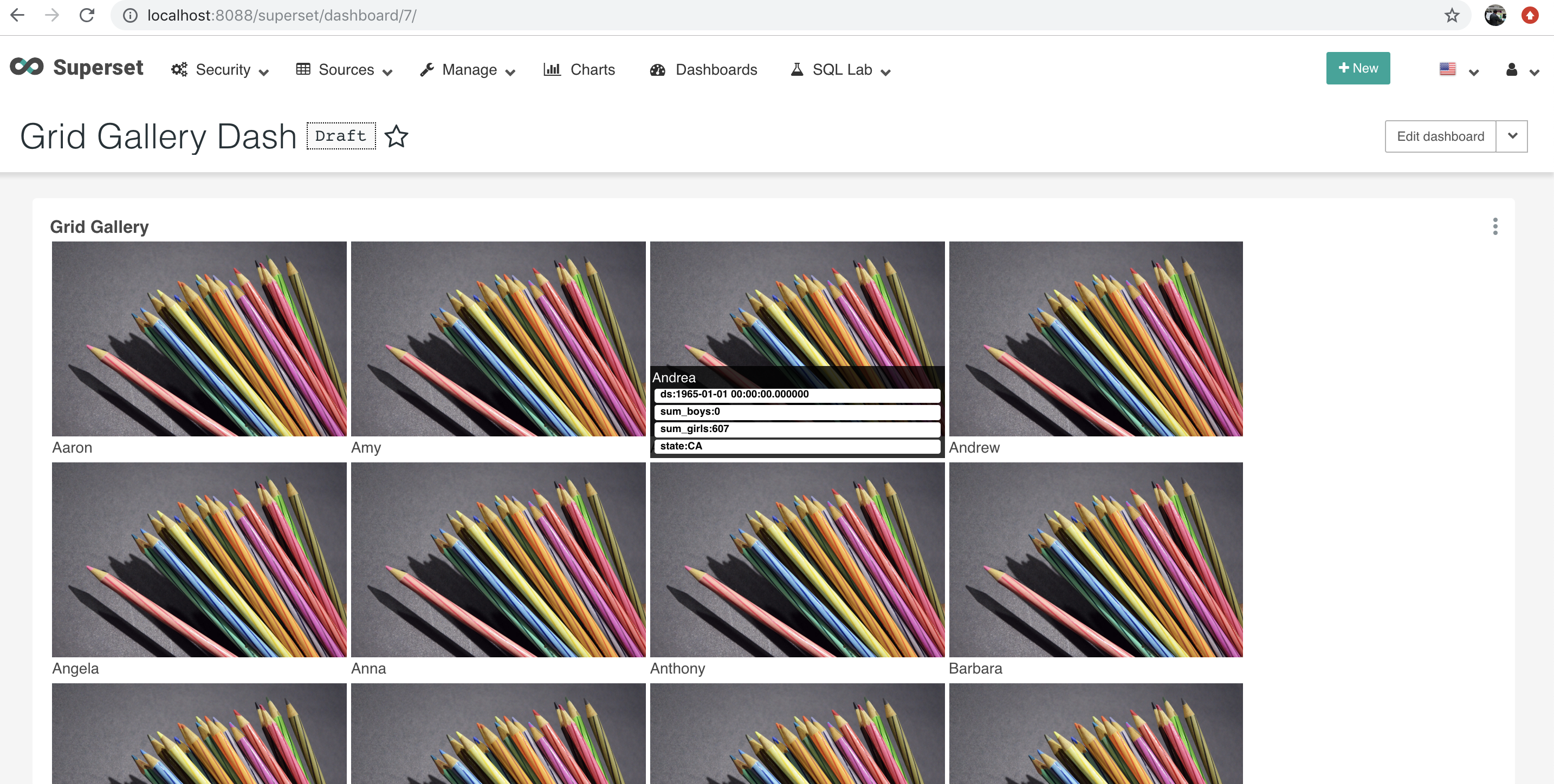 Grid Gallery is a custom visualisation added in superset to solve use cases like showing table with images with description and addition information like trending e-commerce websites are showing their menu items.