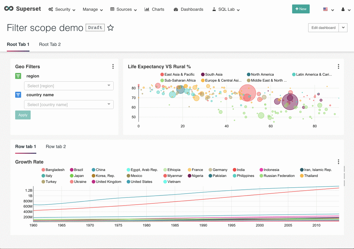 With the growing size of the dashboard, user may want to apply one dashboard filter to some of charts in dashboard, and one filter apply to another set of charts. A very common use case is user groups similar charts in different tabs, and make a filter only applicable for this group. Currently the way to set filter's scope is not very easy to use: