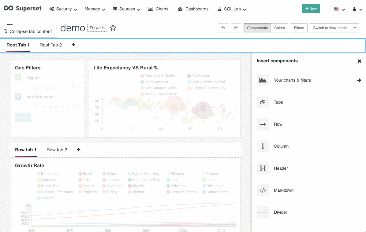 Superset dashboard stores layout data in a tree structure. This layout structure always contains a root component. A root component will have a grid component (for dashboard without tabs) or a root-level tabs components as its children. In the dashboard, every UI component (tabs, row, column, and chart, etc) is a tree node. For example:
