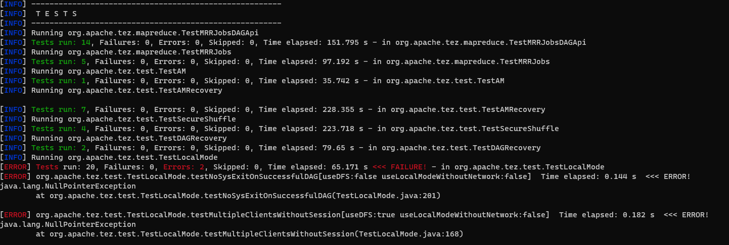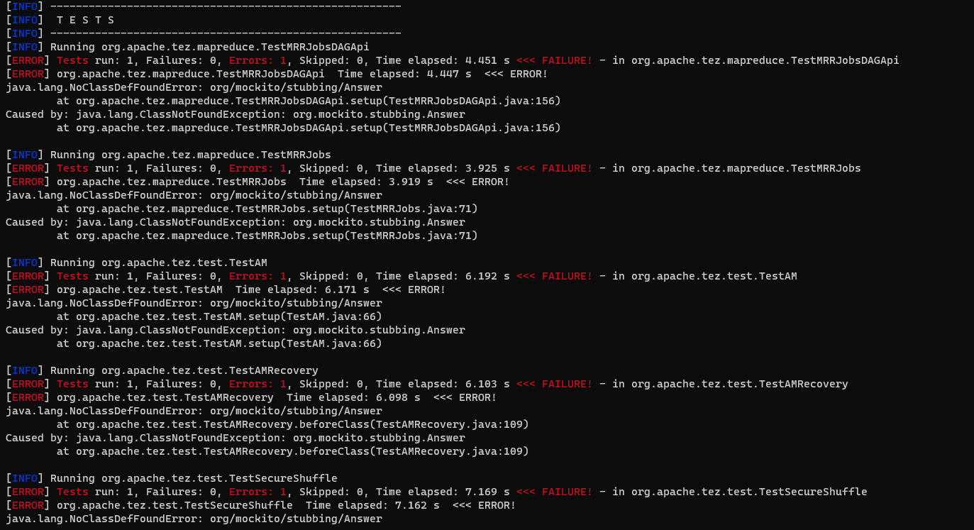 I see these test failures in the tez-tests module. Currently fixing it @abstractdog @steveloughran This issue comes when PowerMock library conflicts with Mockito as described here https://stackoverflow.com/questions/71973762/java-lang-nosuchmethoderror-org-mockito-answers-getlorg-mockito-stubbing-answ |