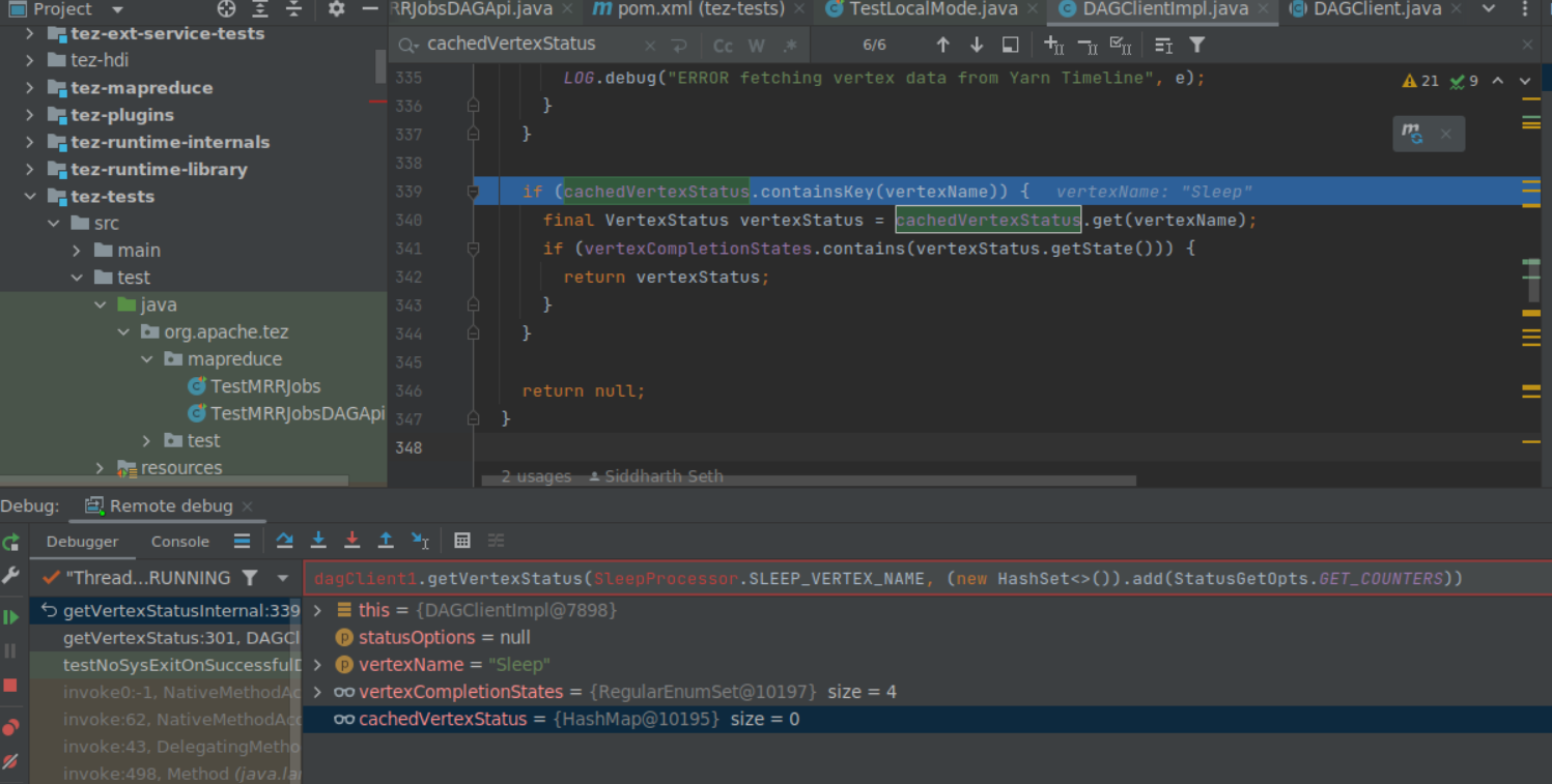 Got the issue : When I debugged this tests I found this : When it tries to get from the cachedVertexStatus (size : 0) the status of vertexName "sleep" it does not find any entry and therefore returns null. And hence, @abstractdog Can you please check this from your end, maybe we need to add some config to have an entry for the Sleep vertex name in cachedVertexStatus |