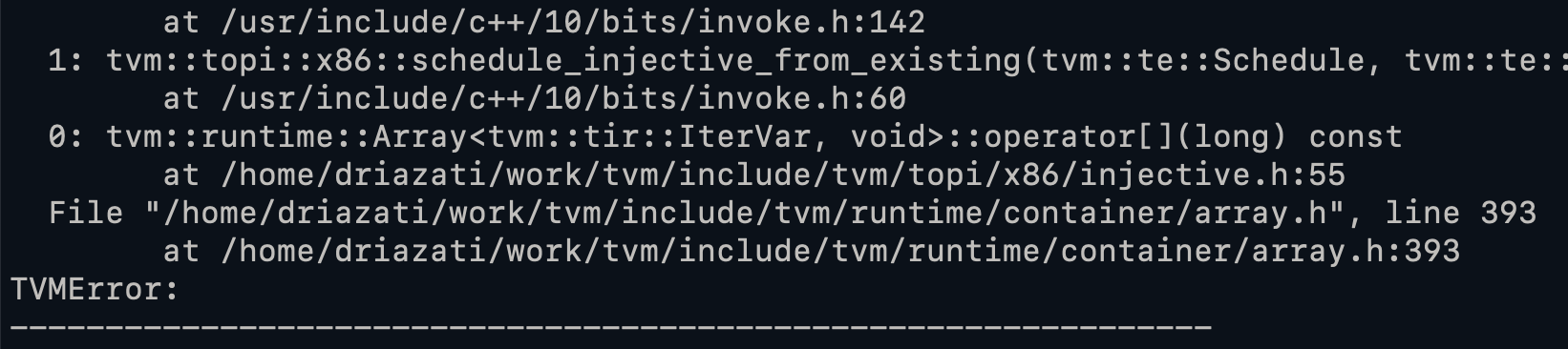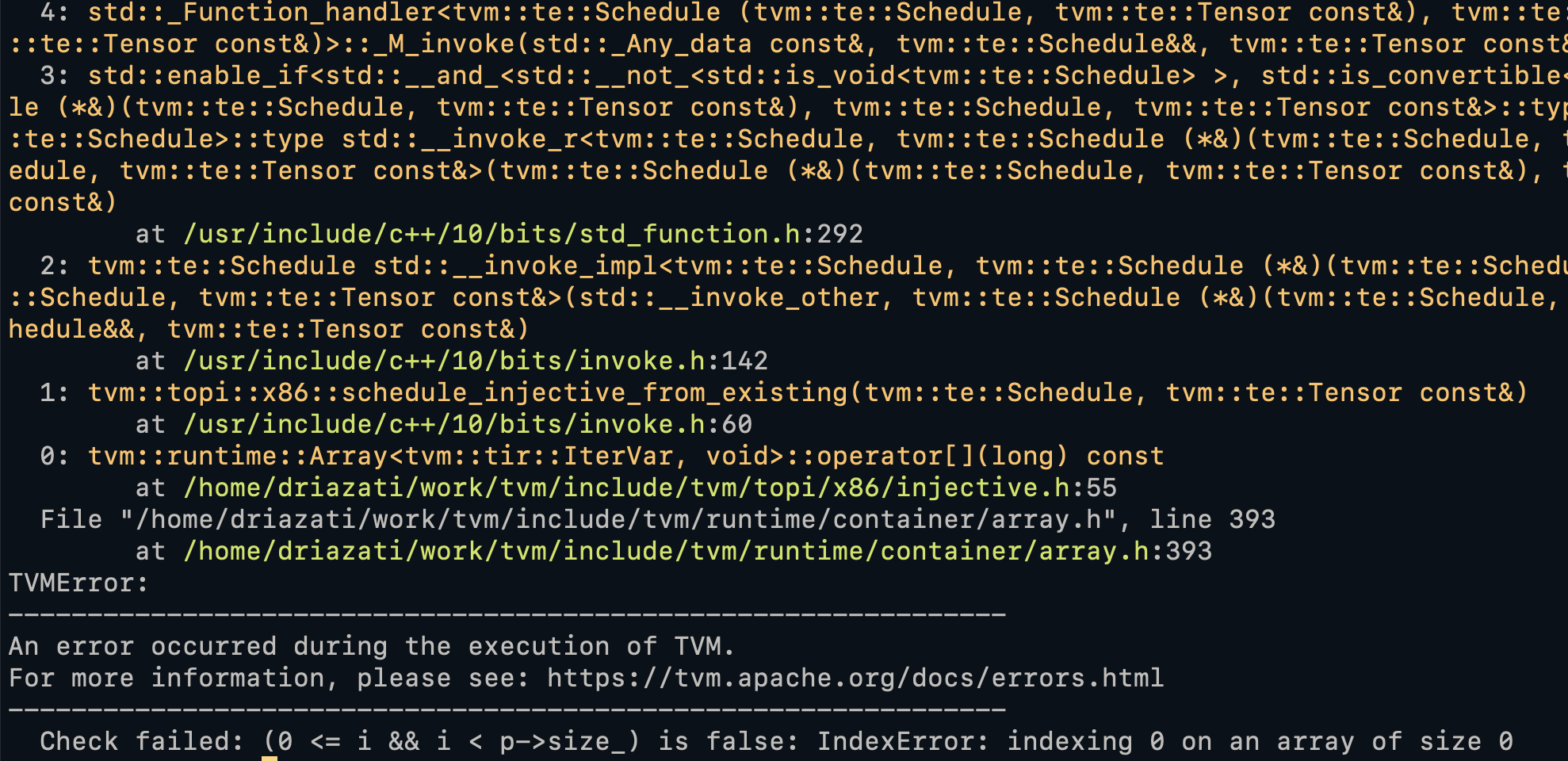 TVM_BACKTRACE_LIMITwhich can be used to limit the length of backtraces at runtime. The combo of these two helps make backtraces easier to read at a glance.export TVM_BACKTRACE_LIMIT=5 python some_code_with_an_error.pyPiping through something disables colors