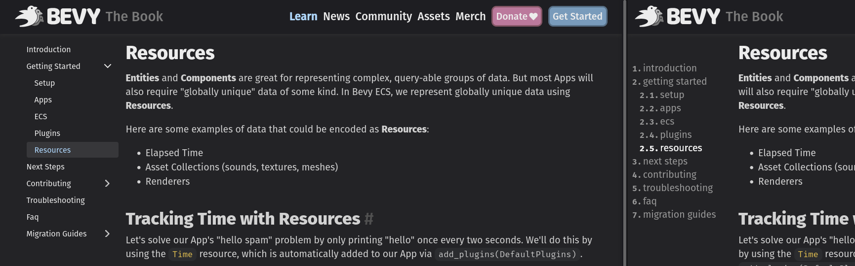 Now I see that maybe I over-stepped on some decisions, sorry for that. In any case, any of the points you mention should be easy to revert (although, looks like it won't be necessary 😅). Dimming of the non-selected items (as it's now in prod), sounds like a nice UX win; let me know if you prefer me to look into it. I did the chevron myself in Figma; it's actually in the same "file" as the chart in #290. Same for the hamburger and the "X" icons used in #315. I gave @alice-i-cecile the ownership of that file… but now that I think it, probably you should be the owner. ^_^ Oh, btw, the Tera macro is recursive so nested menus work as well. I just copied the "Getting Started" folder inside "FAQ" and it just works: @BlackPhlox yup, the sticky menu is done in #315. I've actually made this PR because of that PR, on mobile the docs menu looks a little bit off: small text, with small hit bboxes. Once I sync with this PR the mobile menu should look muuuuch better. |