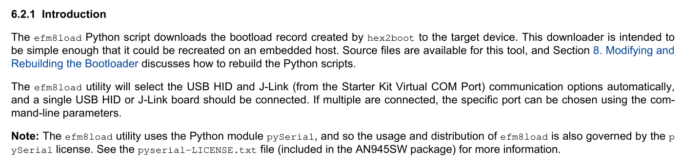 EFM8 Factory Bootloader package AN945SW contains all EFM8 bootloader images with UART, USB or SMBus interface. And various utilities such as: