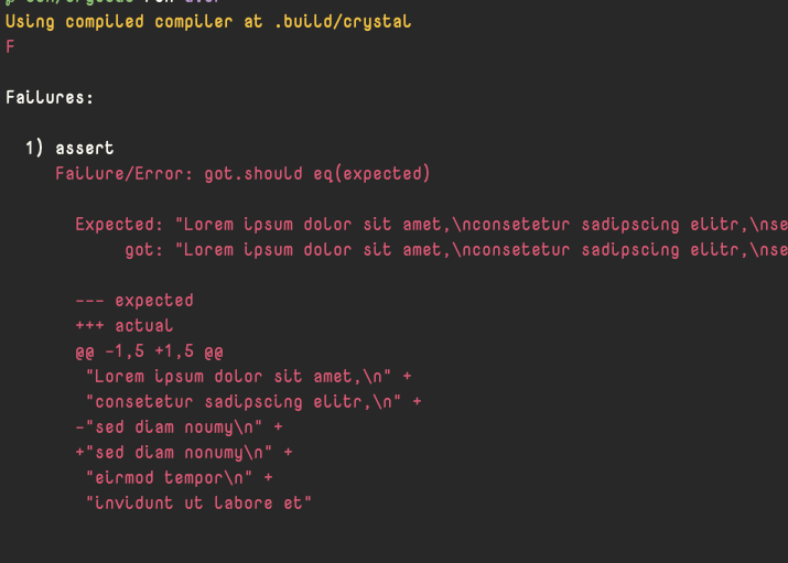 I have a diffing library that can be used. https://github.com/dsisnero/similar.cr/tree/main, ir is a port of a rust library |